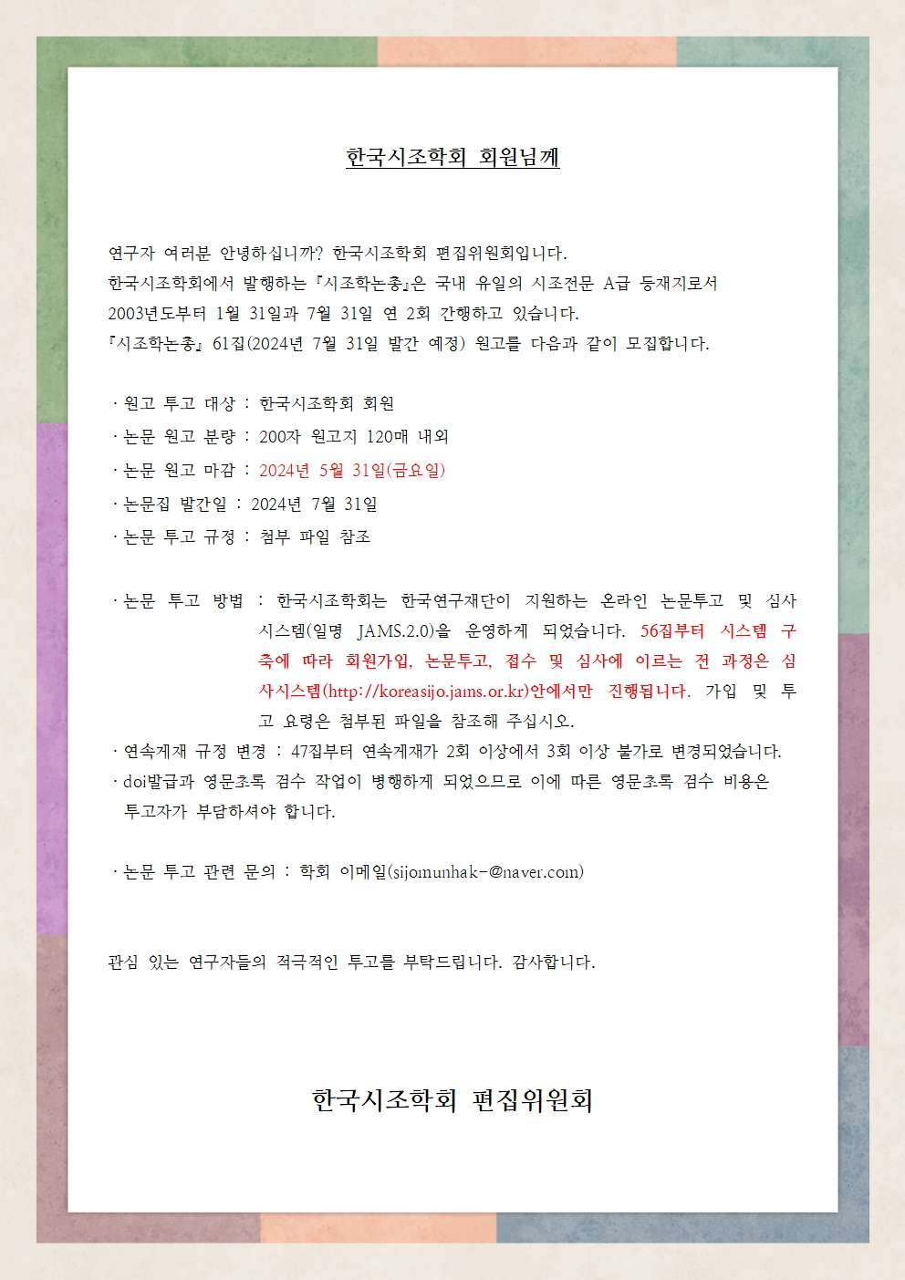 시조학논총 61집(마감 날짜 2024년 5월 31일) 논문 투고 안내