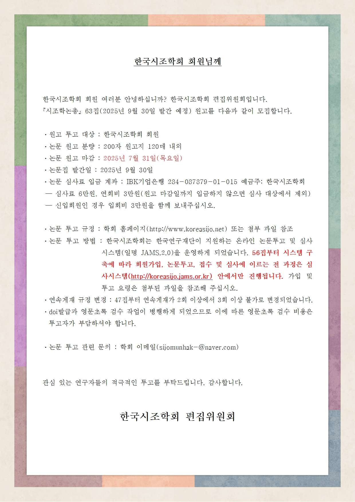 시조학논총 63집(마감 날짜 2025년 7월 31일) 논문 투고 안내